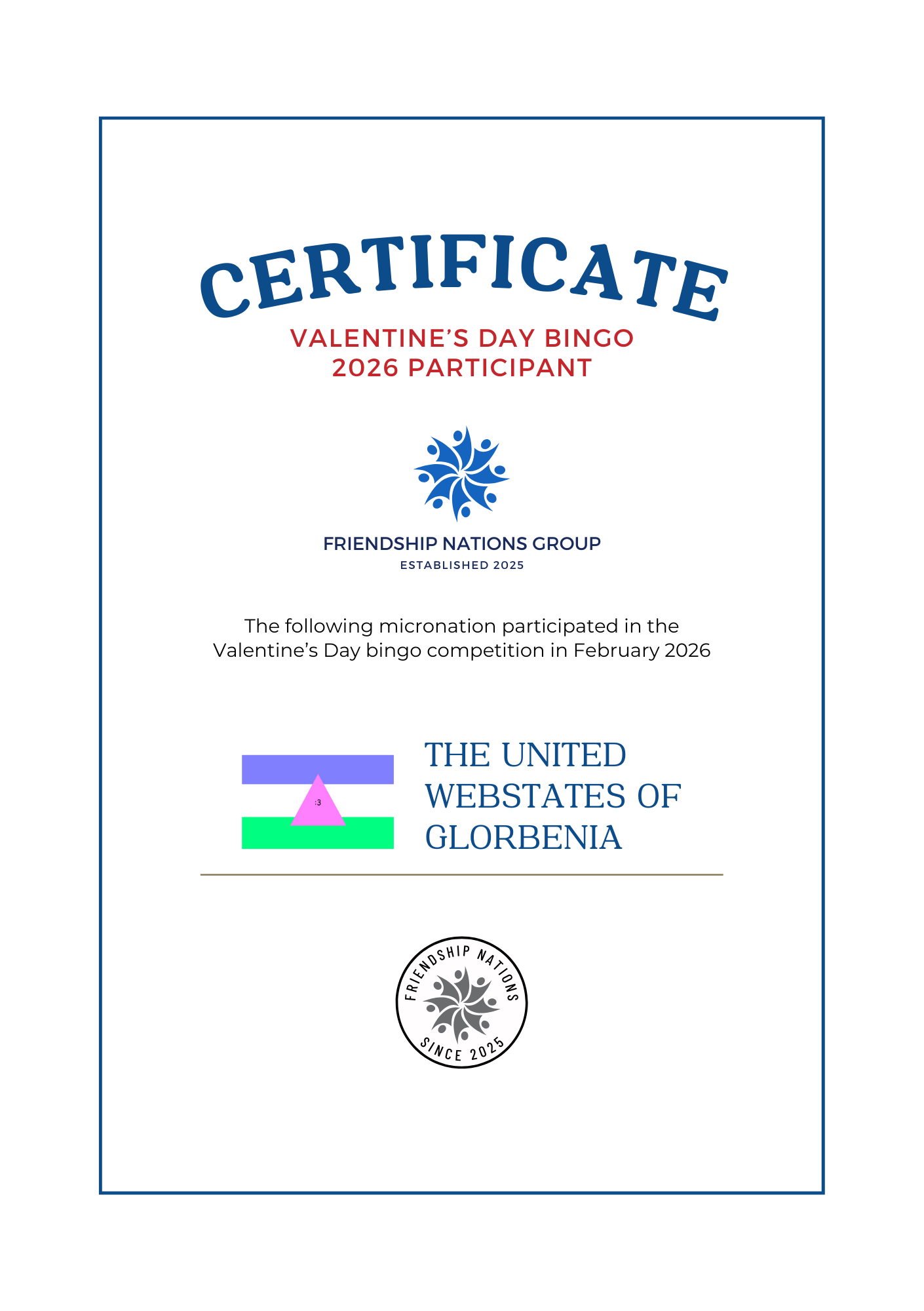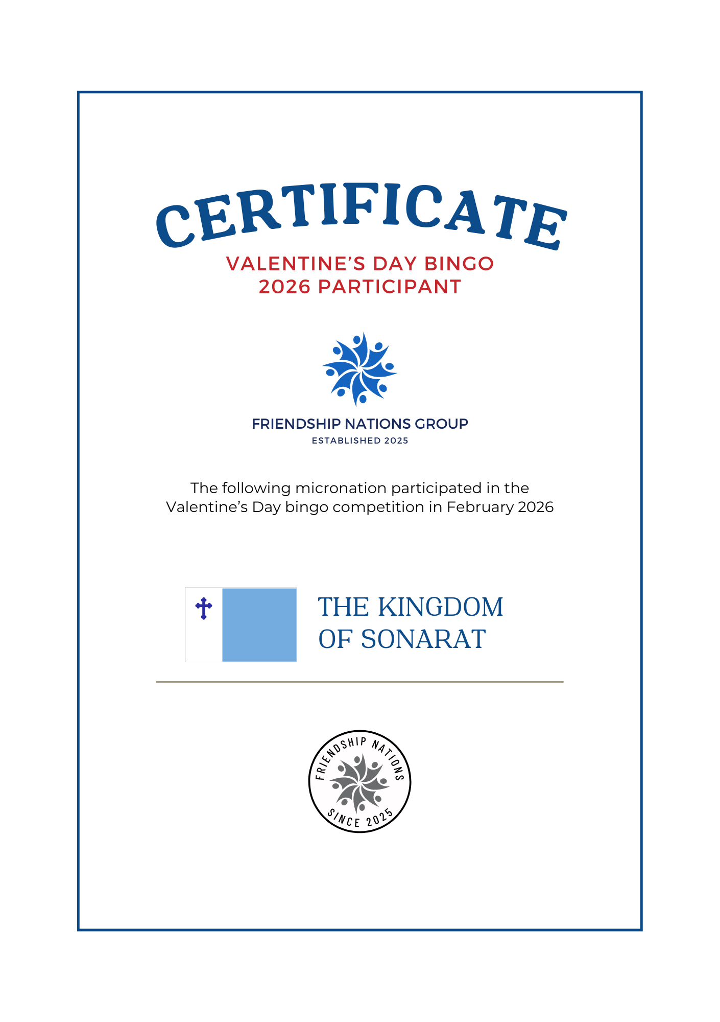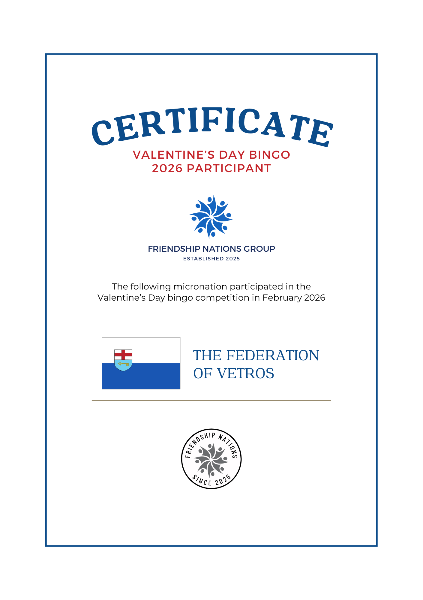 The Valentine's Day bingo competition is an annual event open to all members of the group. Micronations can choose any card
