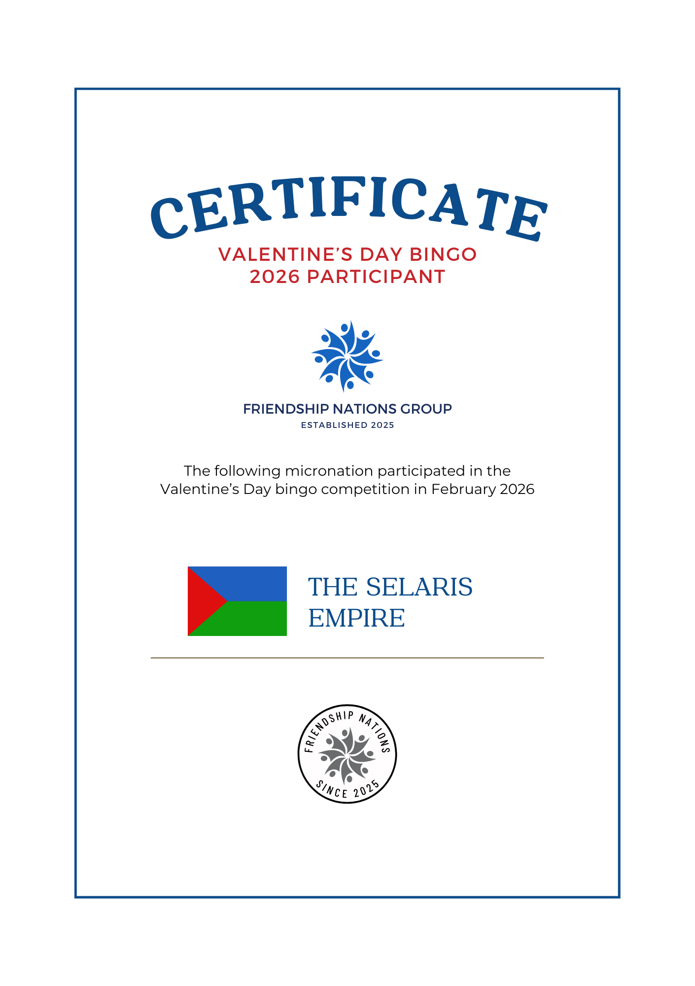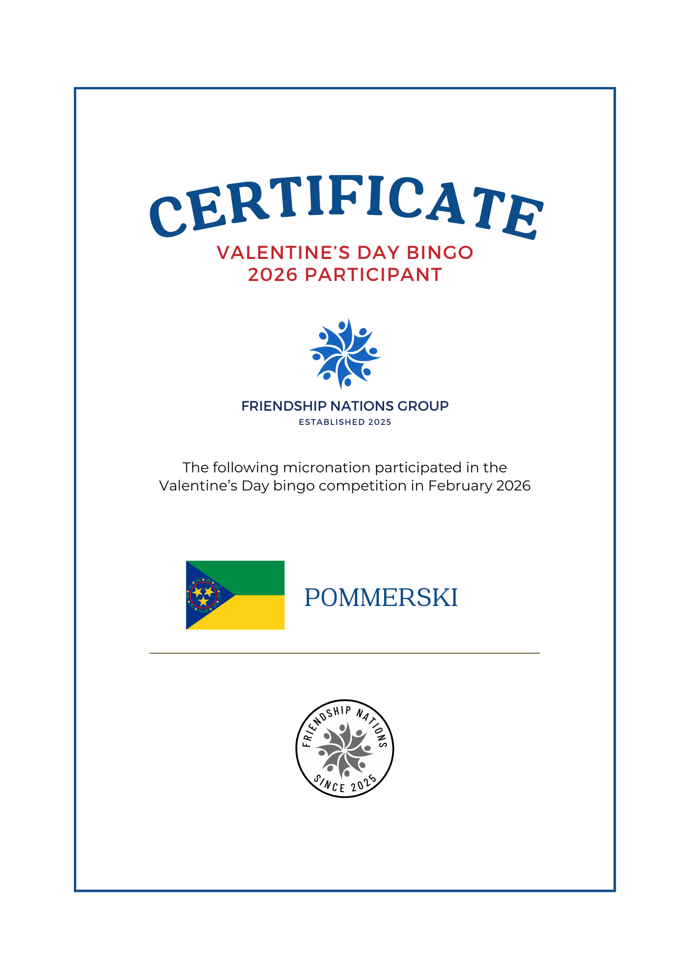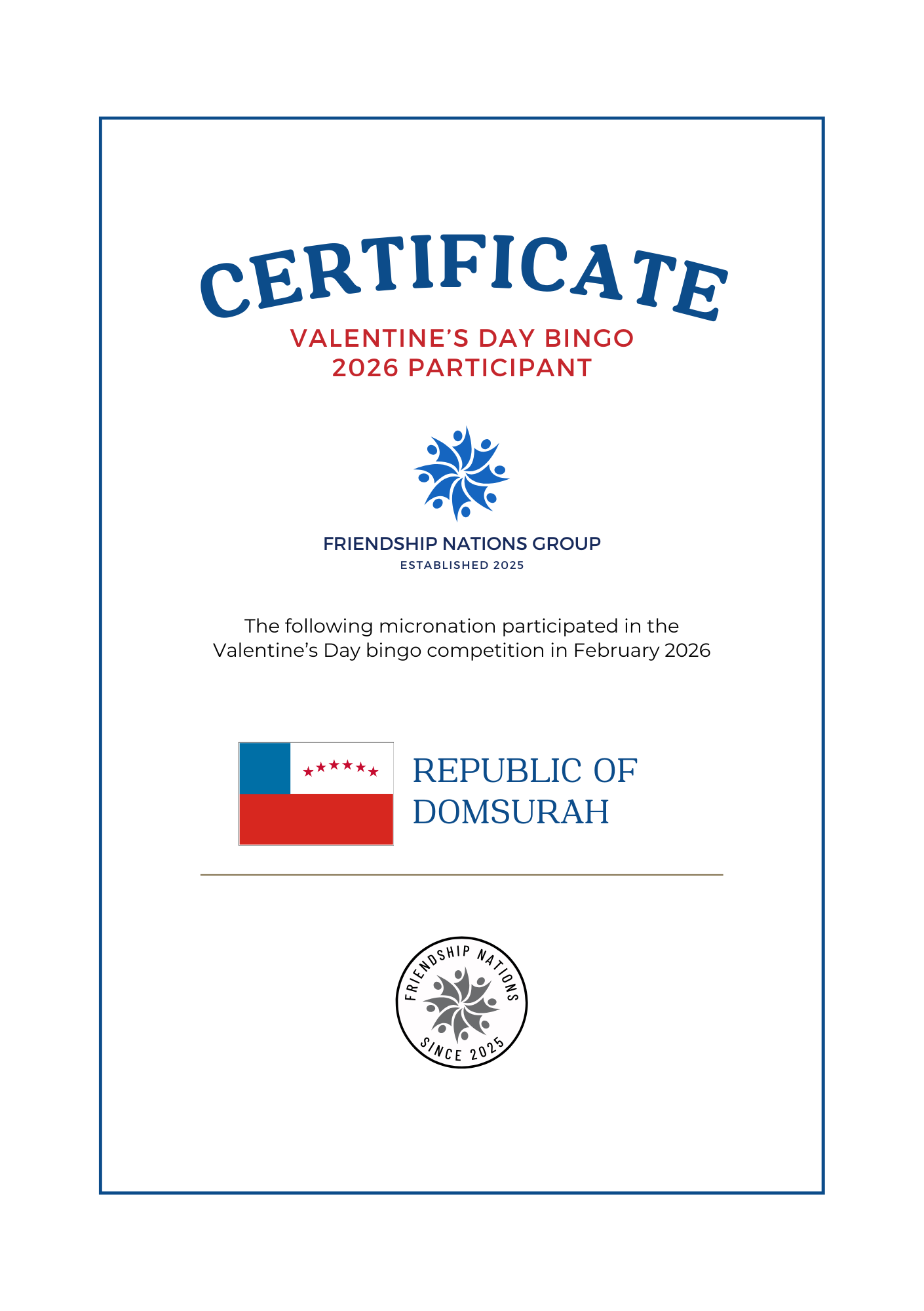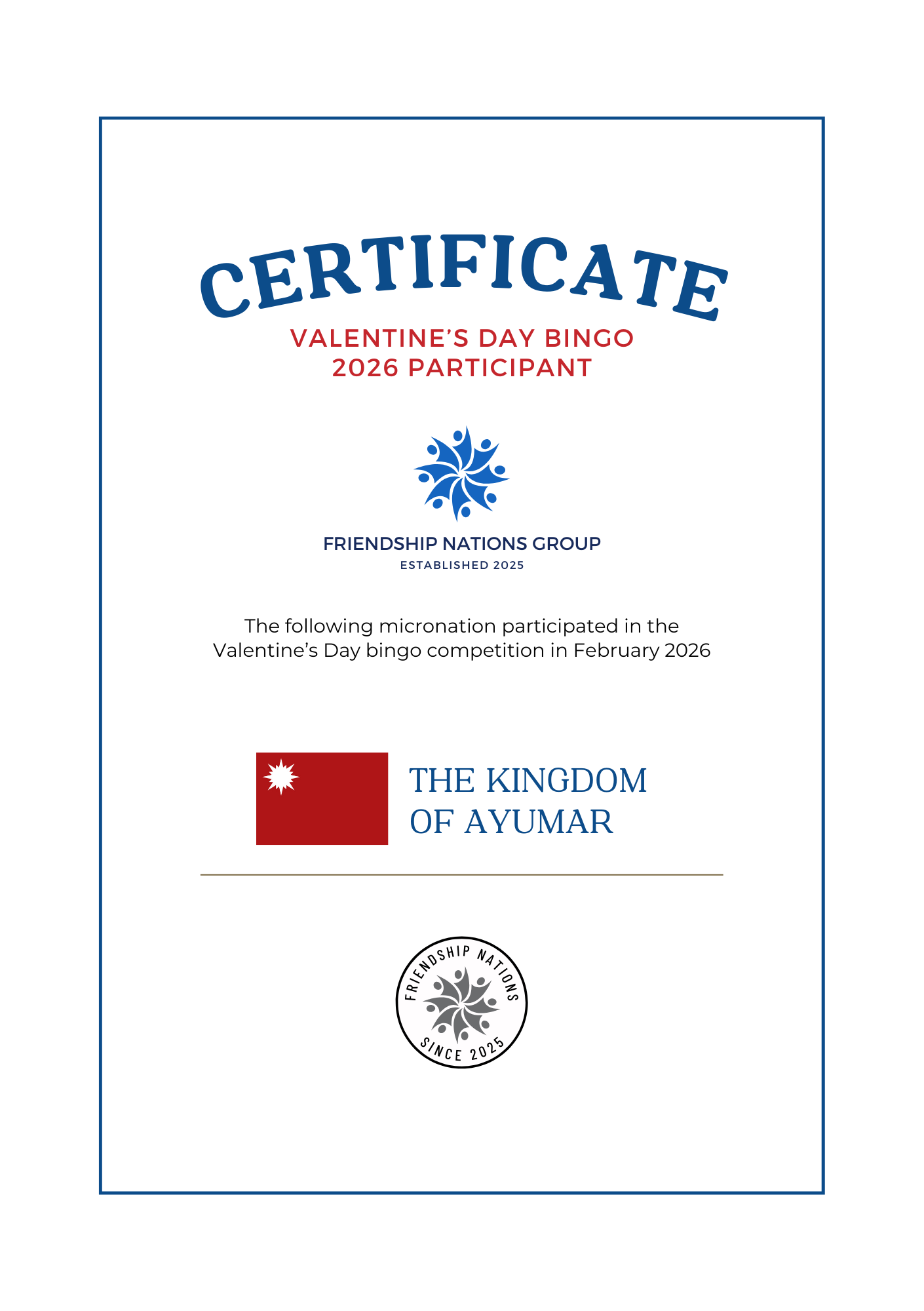 The Valentine's Day bingo competition is an annual event open to all members of the group. Micronations can choose any card