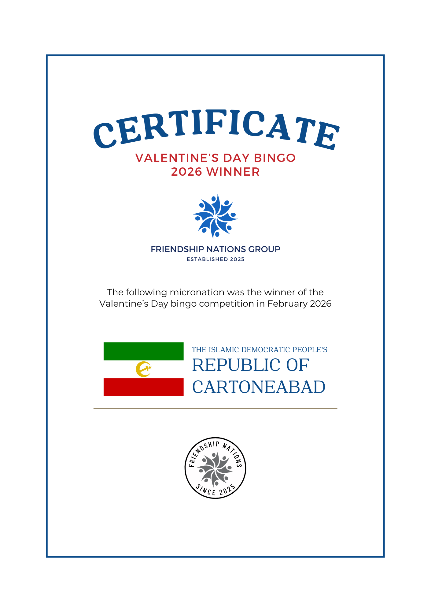Bingo Competition Winner:  The Islamic Democratic People's Republic of Cartoneabad